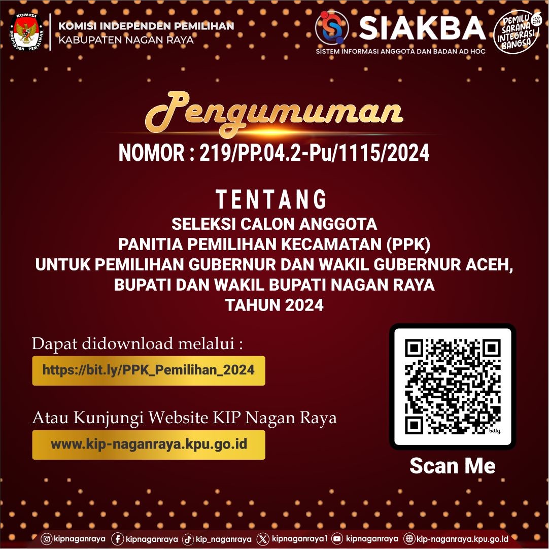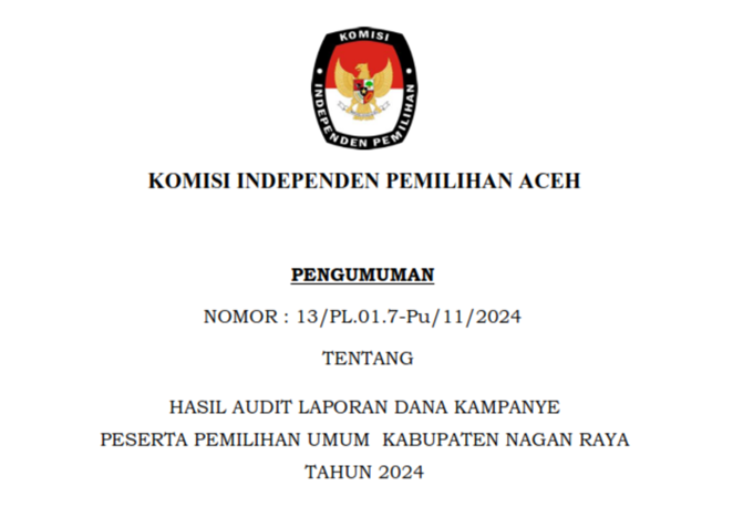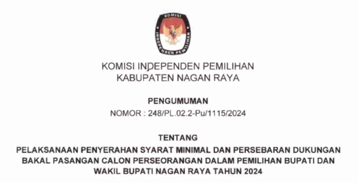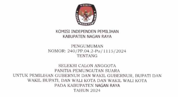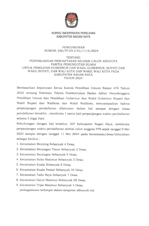Berikut ini Pengumuman KIP Kabupaten Nagan Raya Nomor : 247/PP.04.2-Pu/1115/2024 Tentang Ralat Pengumuman Nomor 244/PP.04.2-Pu/1115/2024 Tentang Hasil Penelitian Administrasi Calon Anggota Panitia Pemilihan Kecamatan Untuk Pemilihan Gubernur dan Wakil Gubernur, Bupati dan Wakil Bupati, dan Walikota dan Wakil Walikota Pada Kabupaten Nagan Raya Tahun 2024.