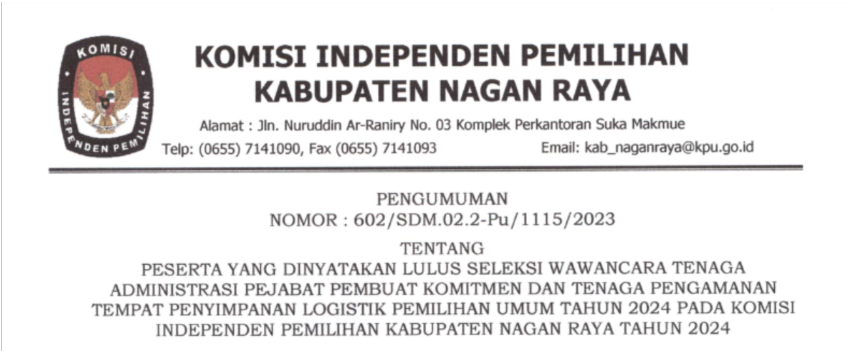 SUKA MAKMUE - Pengumuman Nomor : 651/PL.01.6-Pu/1115/2023 tentang Tim Kampanye Pemilu Presiden dan Wakil Presiden Tingkat Kabupaten Nagan Raya Dalam Pemilihan Umum Tahun 2024, sebagaimana tercantum dalam lampiran pengumuman ini.