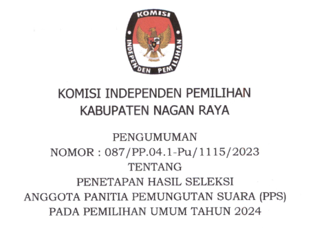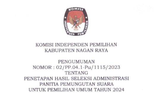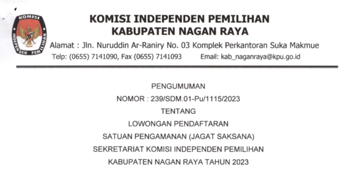 Pengumuman Nomor : 239/SDM.01-Pu/1115/2023 tentang Lowongan Pendaftaran Satuan Pengamanan (Jagat Saksana) Sekretariat Komisi Independen Pemilihan Kabupaten Nagan Raya Tahun 2023, sebagaimana tercantum dalam lampiran pengumuman ini.